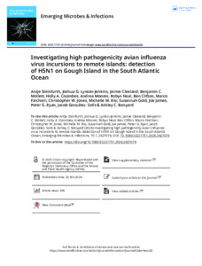 Steinfurth, Antje; Lynton-Jenkins, Joshua G.; Cleeland, Jaimie; Mollett, Benjamin C.; Coombes, Holly A.; Moores, Andrea; Neal, Robyn; Clifton, Ben; Falchieri, Marco; Jones, Christopher W.; Risi, Michelle M.; Gold, Susannah; James, Joe; Ryan, Peter G.; González- Solís, Jacob; Banyard, Ashley C.. 2026 Investigating high pathogenicity avian influenza virus incursions to remote islands: detection of H5N1 on Gough Island in the South Atlantic Ocean. Emerging Microbes & Infections, 15 (1). 10.1080/22221751.2026.2627076