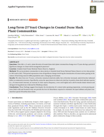 •Results: We show that over 37 years, α-diversity remained relatively stable, but γ-diversity increased, and β-diversity indicated shifts in community structure. Specifically, across the open dunes we observed a decline in positive dune slack indicator species (i.e., of conservation interest), an increase in Salix repens (frequency, cover and height) and a shift towards shade-tolerant and nitrogen-loving plants (as evidenced by Ellenberg values).