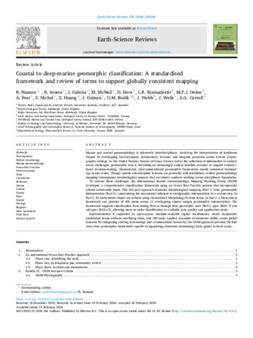 Nanson, R.; Arosio, R.; Gafeira, J.; McNeil, M.; Dove, D.; Bjarnadóttir, L.R.; Dolan, M.F.J.; Post, A.; Nichol, S.; Huang, Z.; Guinan, J.; Bialik, O.M.; Webb, J.; Wells, J.; Carroll, A.G.. 2026 Coastal to deep-marine geomorphic classification: a standardised framework and review of terms to support globally consistent mapping. Earth-Science Reviews, 276, 105439. 10.1016/j.earscirev.2026.105439