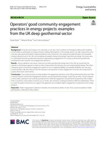 Ryder, Stacia; Rohse, Melanie; Abesser, Corinna. 2026 Operators’ good community engagement practices in energy projects: examples from the UK deep geothermal sector. Energy, Sustainability and Society, 16 (1), 19. 10.1186/s13705-026-00566-y